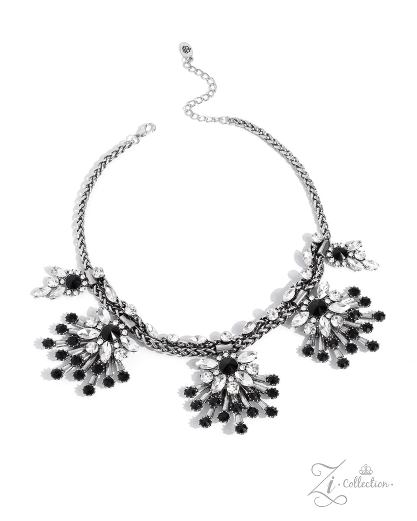 A thick silver chain gives way to an ornately woven band of silver along the neckline, creating a bold braid. Sporadically dotted atop the cording, white round and marquise-cut gems alternate above a collection of flared frames, adding a bit of lively dazzle. Clusters of black defaced gems, emerald-cut silver bars, round white rhinestones and gems, and marquise-cut white gems gradually increase in resplendence and radiance along the center of the design, creating an art-deco-inspired fringe of uncompromising sparkle. Features an adjustable clasp closure.