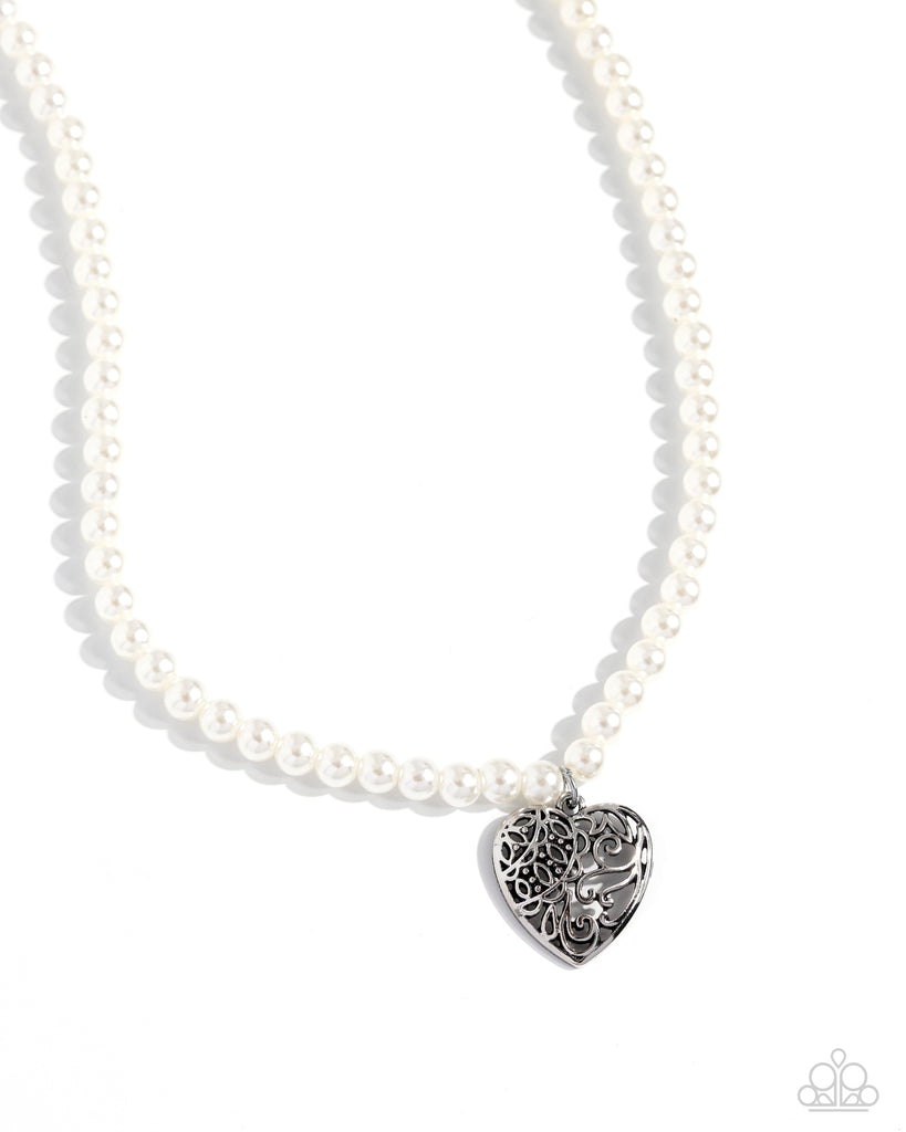 A dainty collection of glossy white pearls gives way to an oversized filigree-filled silver heart frame, creating an antiqued locket-inspired look. Features an adjustable clasp closure.