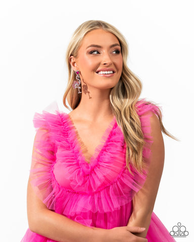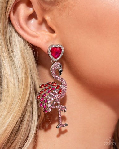 Pressed in a white rhinestone-dusted border, a fuchsia heart gem glistens from the ear, giving way to a silver flamingo post embellished in light rose, black, and white rhinestones, coalescing along the head and body. Red, fuchsia, and light rose gems and iridescent light rose rhinestones create the tail feathers of the flamingo for a flashy flair. Earring attaches to a standard post fitting. Due to its prismatic palette, color may vary.