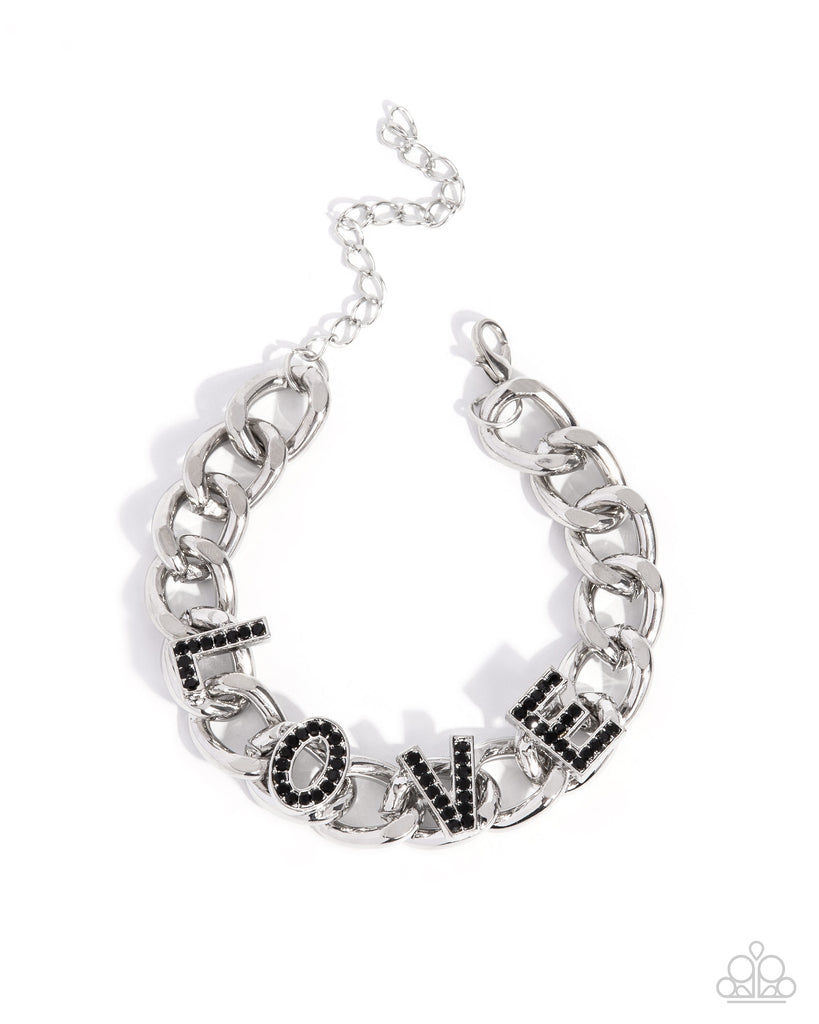Featured along the top of a glistening silver curb chain, the word "LOVE" is embellished with glistening black rhinestones for a light-catching display. Features an adjustable clasp closure.