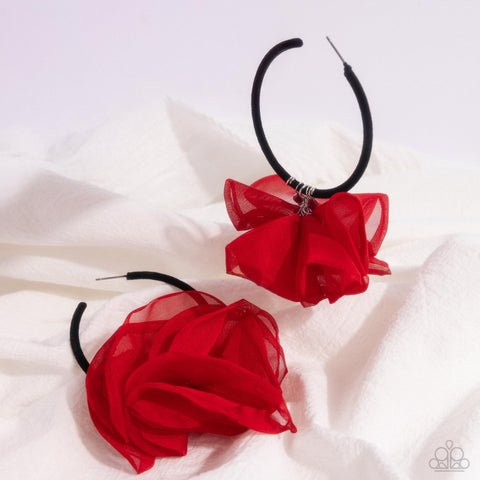 Blooming along the bottom of a black velvet hoop, oversized red chiffon petals featuring red beads for its center, create a fantastical floral frenzy below the ear. Earring attaches to a standard post fitting. Hoop measures approximately 2" in diameter.