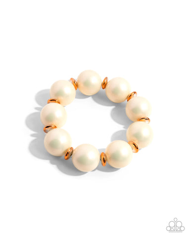 Infused along an elastic stretchy band, a collection of oversized white pearls alternates with metallic orange discs along the wrist for a pop of radically refined color.
