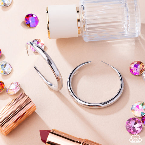 Subtly increasing in width along the center, a sleek silver hoop curls along the ear for a monochromatic, mesmerizing display. Earring attaches to a standard post fitting. Hoop measures approximately 2" in diameter.