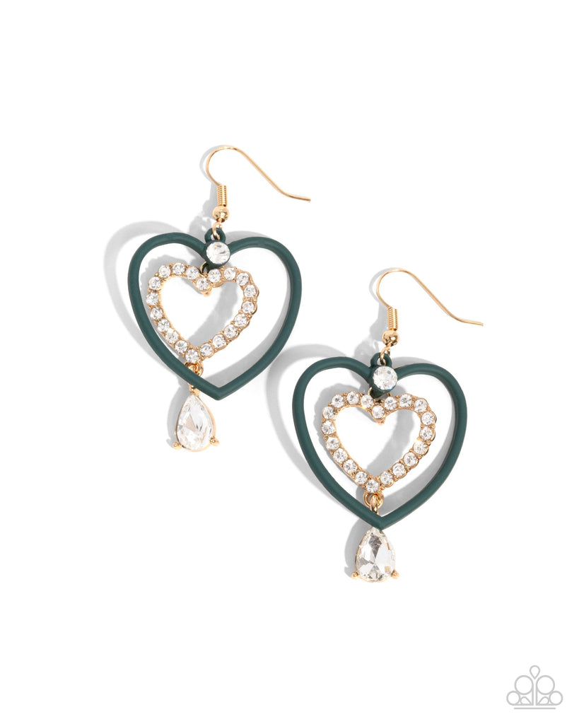 A dainty white rhinestone-encrusted gold heart frame swings from the top of an oversized Aventurine-painted heart frame from a solitaire white rhinestone, creating a charming duo. Pronged in gold fittings, a white teardrop gem charismatically sways below the gold heart frame, peeking out beneath the Aventurine frame for a shimmery finish. Earring attaches to a standard fishhook fitting.