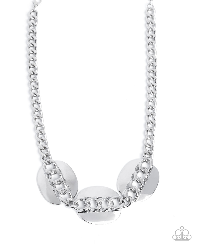 A chunky silver curb chain links together oversized, smooth oval discs, creating a high-shine statement piece. The bold geometric design pairs classic metallic tones with a modern silhouette. Features an adjustable clasp closure.