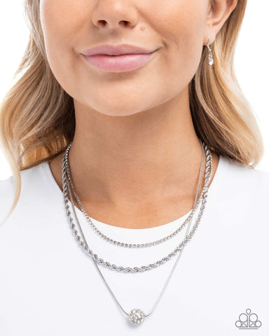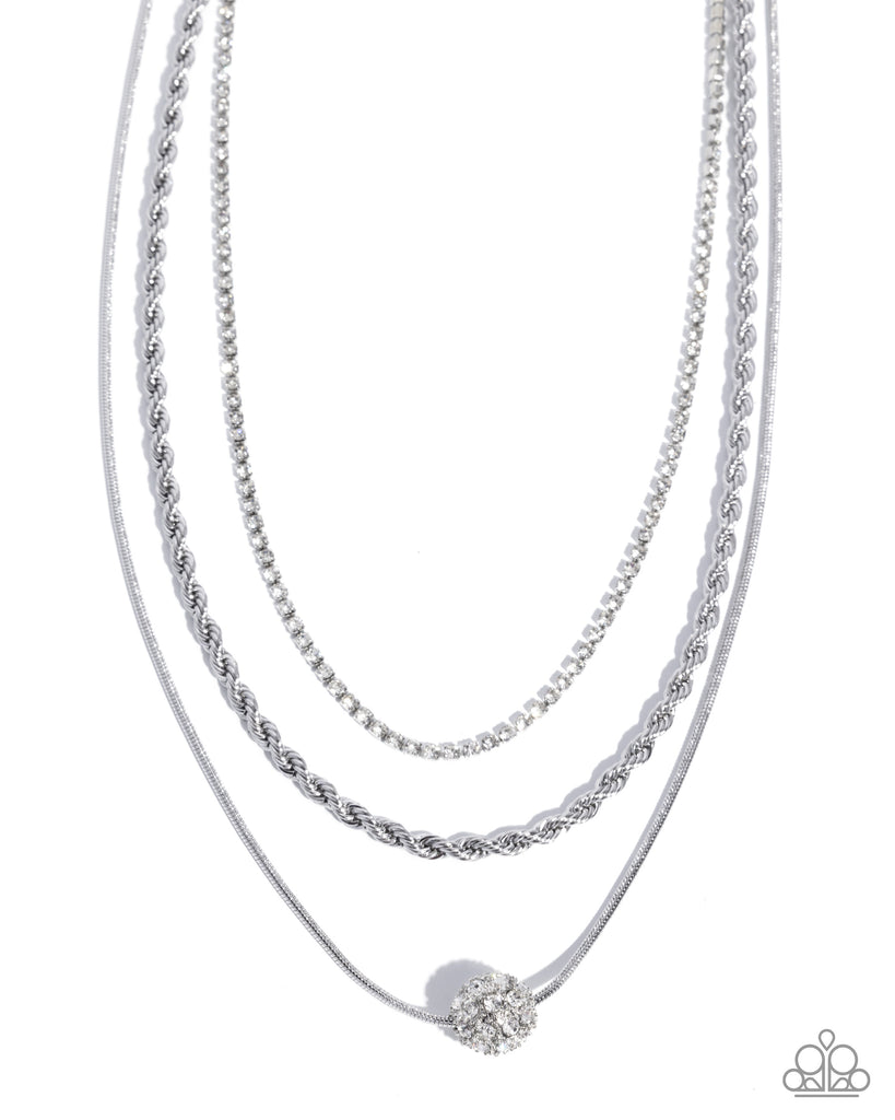 Three mismatched strands of white rhinestones in silver square fittings, a silver rope chain, and a silver snake chain coalesce below the neckline in tiers for a heartstopping haute display. A white rhinestone-dusted silver ornament glides along the lowermost chain for additional shimmer. Features an adjustable clasp closure.